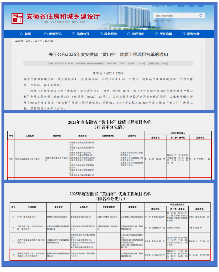 近日,從安徽省住房和城鄉(xiāng)建設廳獲悉,由省住房城鄉(xiāng)建設廳會同省交通運輸廳、省水利廳組織開展的2025年度安徽省建設工程“黃山杯”獎評選活動中,由合肥路橋承建的肥西經開區(qū)湯口路(延喬路-宜秀路西)提升改造工程、參建的明光至巢湖高速公路合肥段雙雙榮獲2025年度安徽省建設工程“黃山杯”獎。